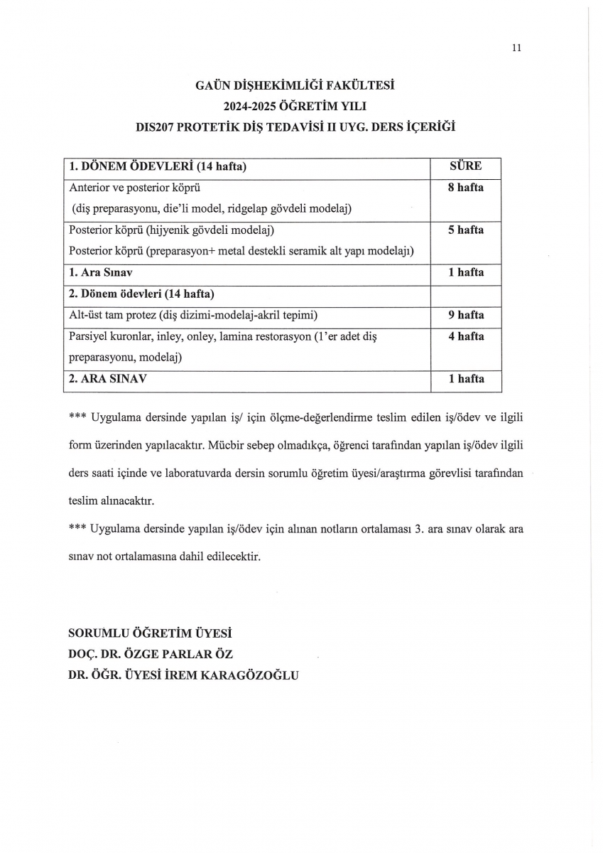 DIS 207 PROSTHETIC DENTAL TREATMENT II PRACTICAL COURSE CONTENT AND ASSESSMENT METHODS
